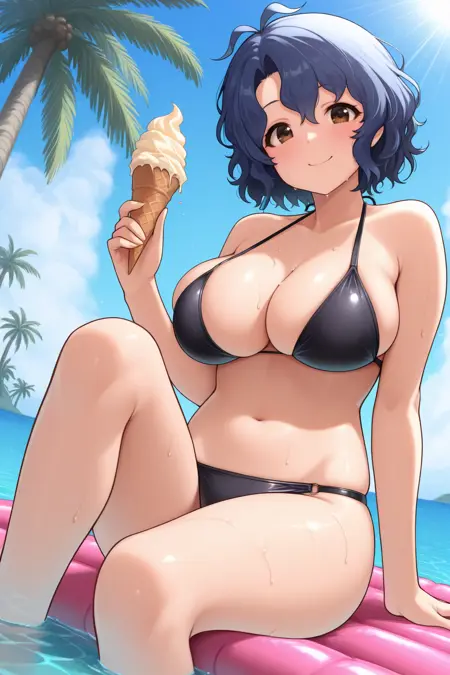 외모: ftk, 단발, 안테나 머리, 물결 모양 머리, 눈 사이의 머리, 파란 머리, 갈색 눈, 큰 가슴