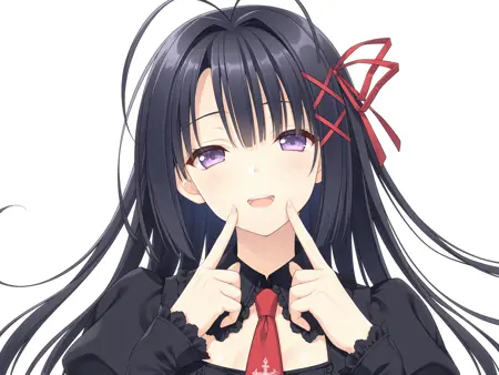 검은 드레스: 1girl, risona, black dress risona, 매우 긴 머리, 앞머리, 검은 머리, 눈 사이의 머리카락, 보라색 눈, x 헤어 장식, 빨간 x 헤어 장식, 안테나 머리, 빨간 헤어 리본, 헤어 장식, 장식용 리본, 긴 소매, 프릴이 달린 드레스, 고딕 드레스, 검은 드레스, 넥타이, 빨간 넥타이, 십자 자수, 장식용 넥타이, 허리 코셋, black_frilled_thighhighs,