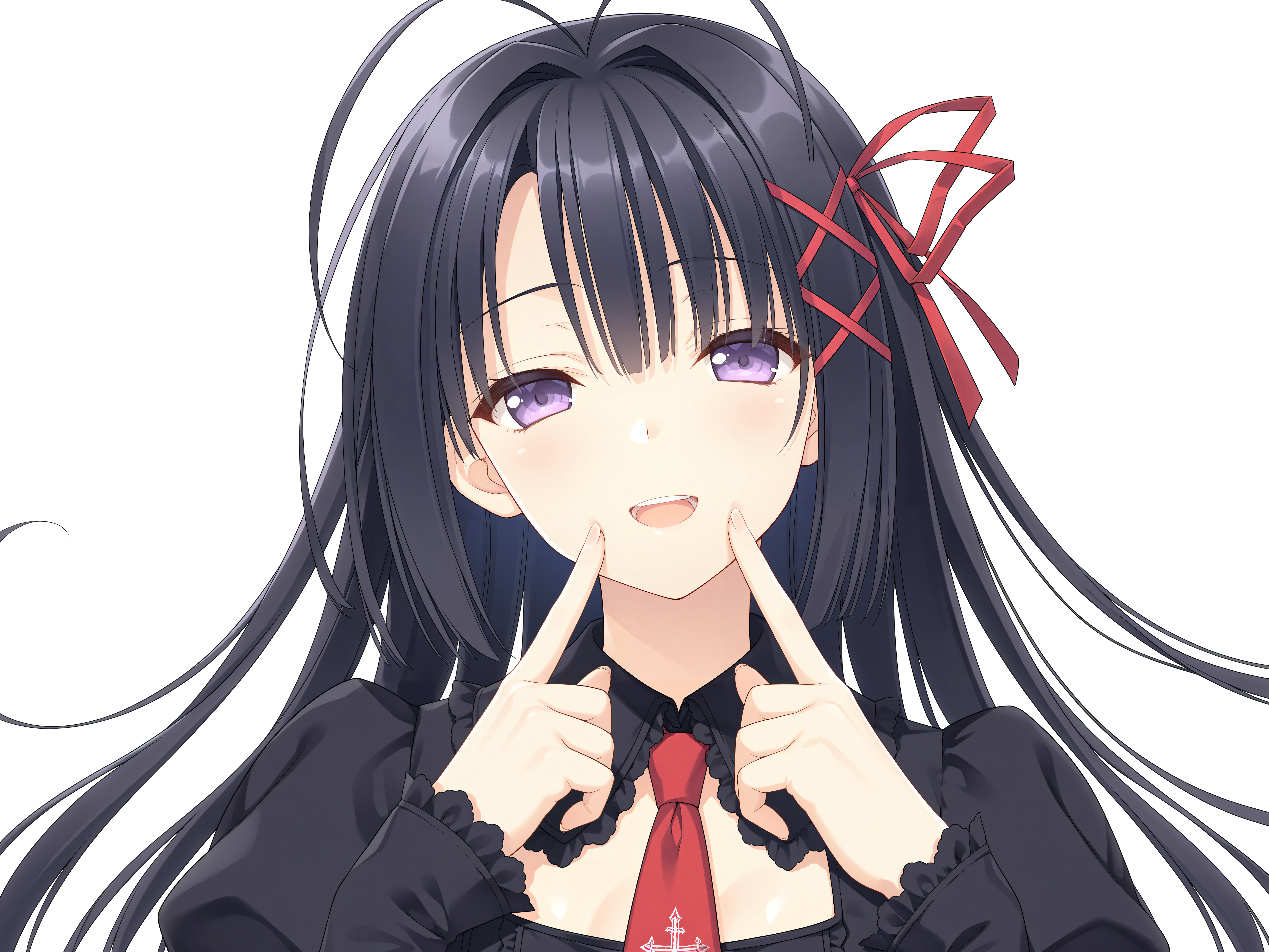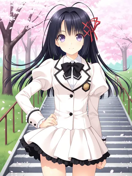유니폼: 1girl, risona, uniform risona, 매우 긴 머리, 검은 머리, 보라색 눈, 빨간 헤어 리본, 헤어 장식, 장식용 리본, 짧은 소매, 학교 유니폼, 흰색 유니폼, 흰 드레스, 검은 테두리, 유니폼 재킷, 칼라 셔츠, 리본, 검은 리본, 주름스커트, 프릴이 달린 팔찌, 장식용 테두리, 단추, 앞머리, 눈 사이의 머리카락, 안테나 머리, x 헤어 장식, 빨간 x 헤어 장식,