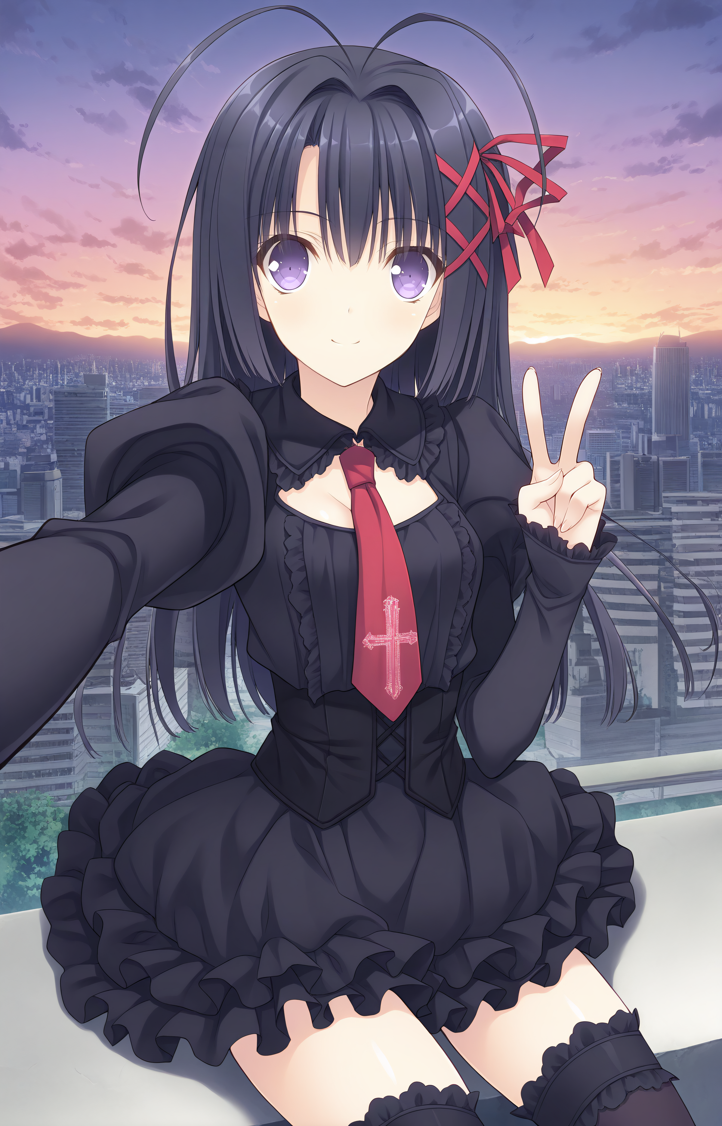 Black dress: 1girl,risona, black dress risona, very long hair, bangs, black hair, hair between eyes, purple eyes,x hair ornament, red x hair ornament, antenna hair, red hair ribbon, hair ornament, decorative ribbon, long sleeves, frilled dress, gothic dress, black dress, necktie, red necktie, cross embroidery, decorative tie, waist corset, black_frilled_thighhighs,