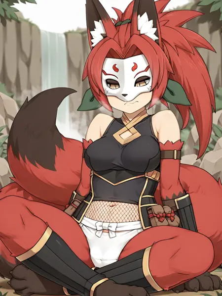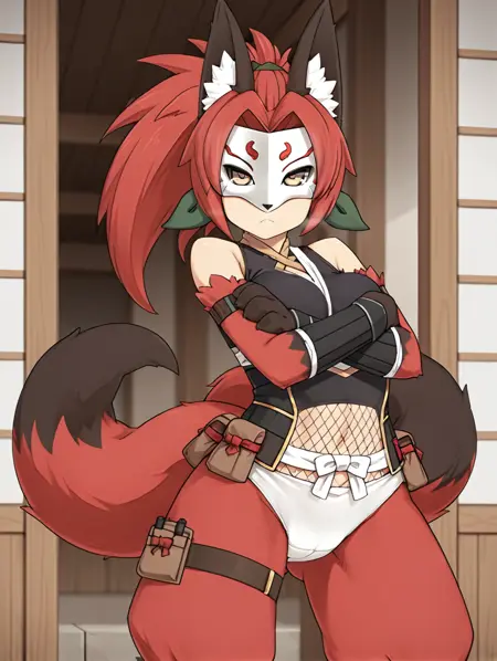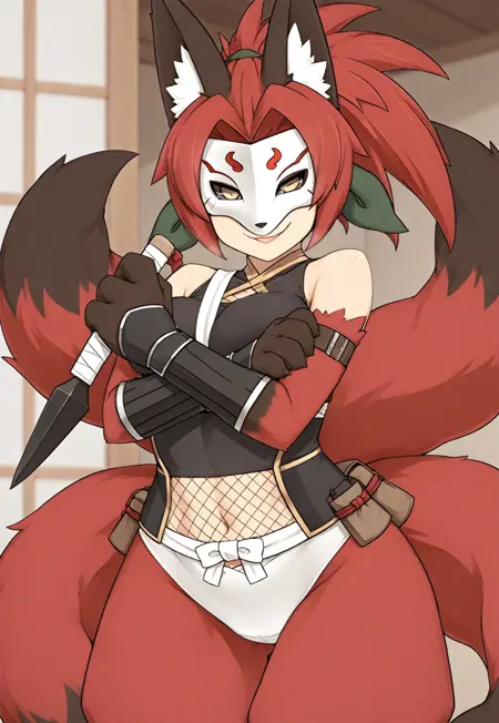 Minamo, red hair, high ponytail, fox ears, fox tail, 3 tails, (bare_shoulders), animal hands, red fur, animal feet, animal legs, white mask, fox mask, black shirt, shirt cutout, mesh on belly, armor, kunoichi, white panties, pouch,