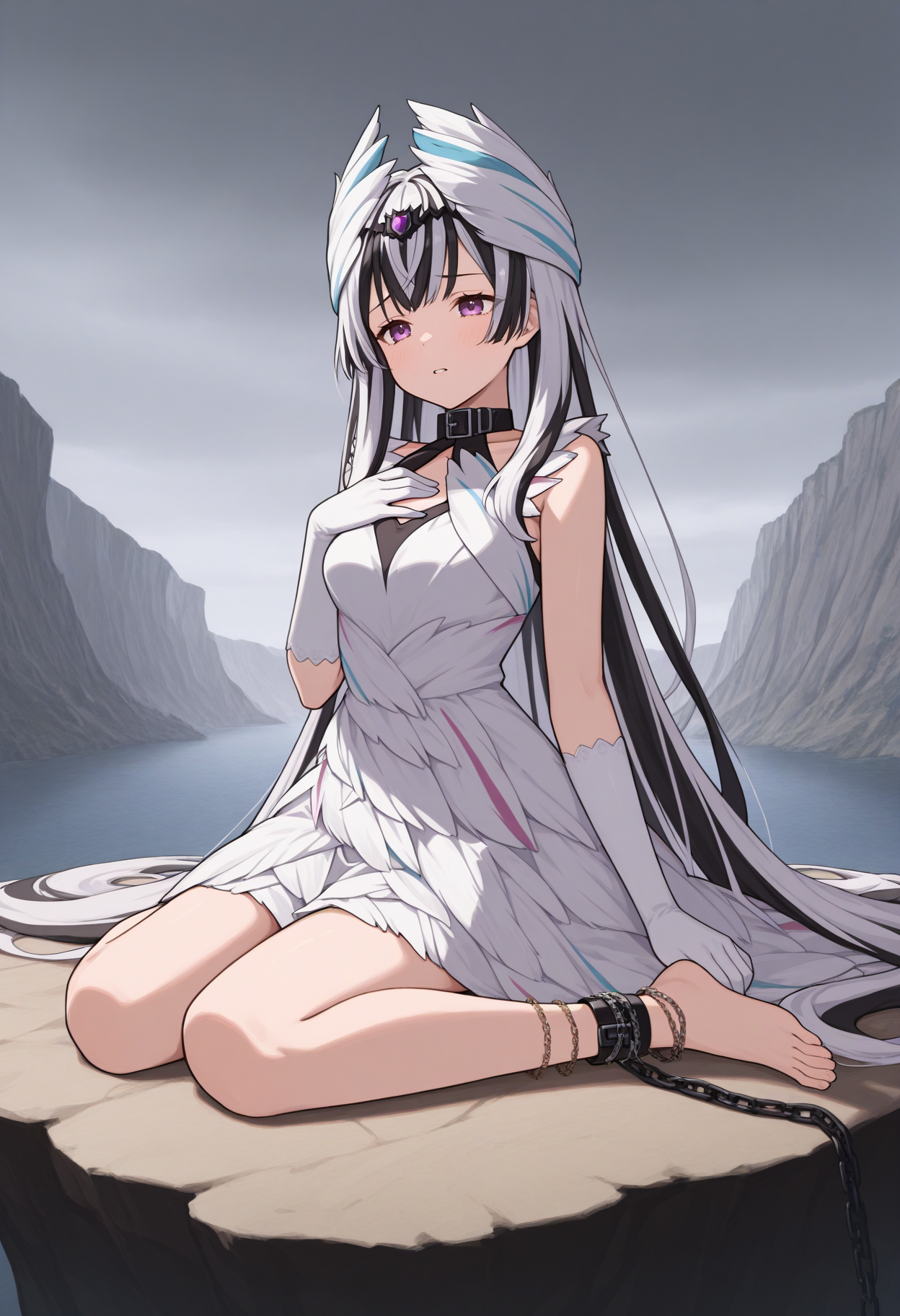Default appearance: dfVeyl, streaked hair, white hair, black hair, feather hair ornament, tiara, very long hair, purple eyes, black choker, feather dress, sleeveless dress, white gloves, elbow gloves, chain anklet, barefoot