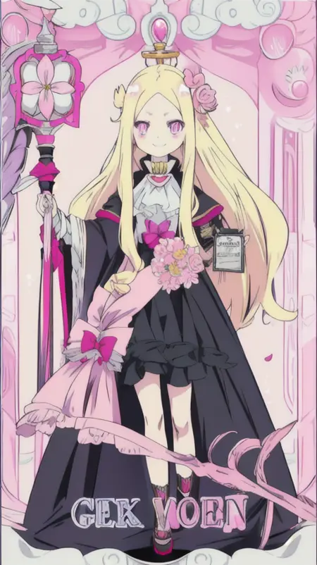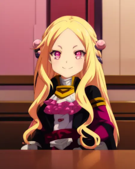 Positive Prompt: blonde hair, pink eyes, black thighhighs, garter straps, hair bobbles, dress.