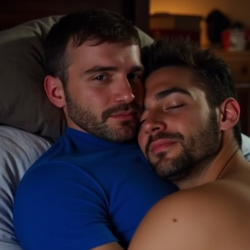 침대에서 남자들이 껴안는 이미지를 생성합니다.