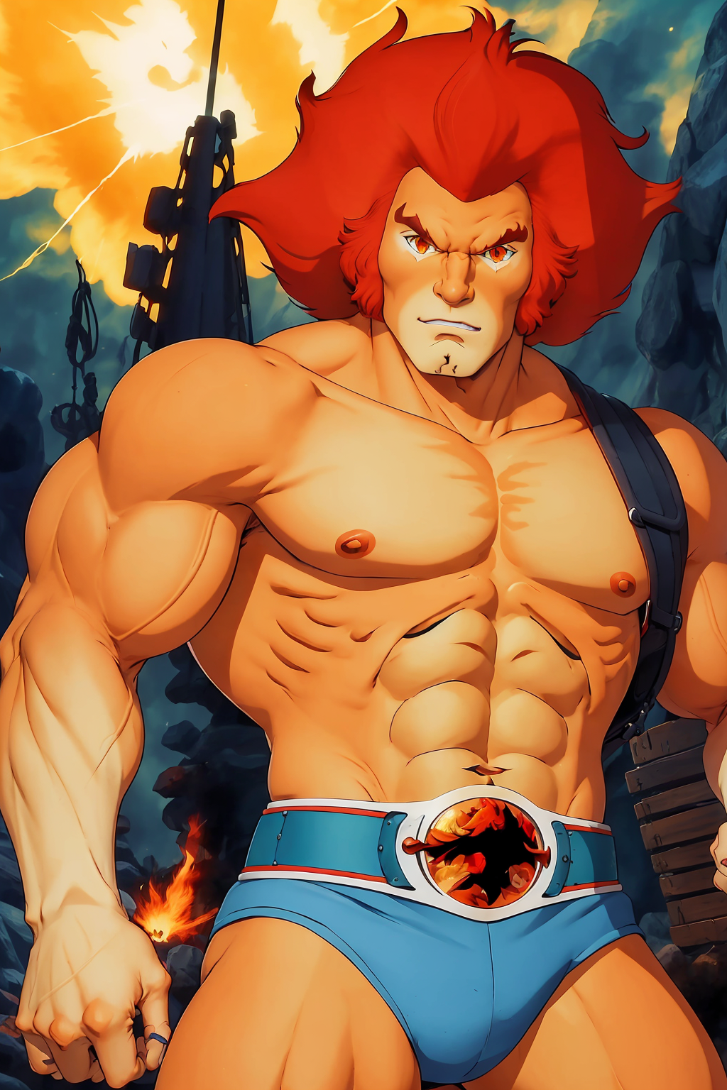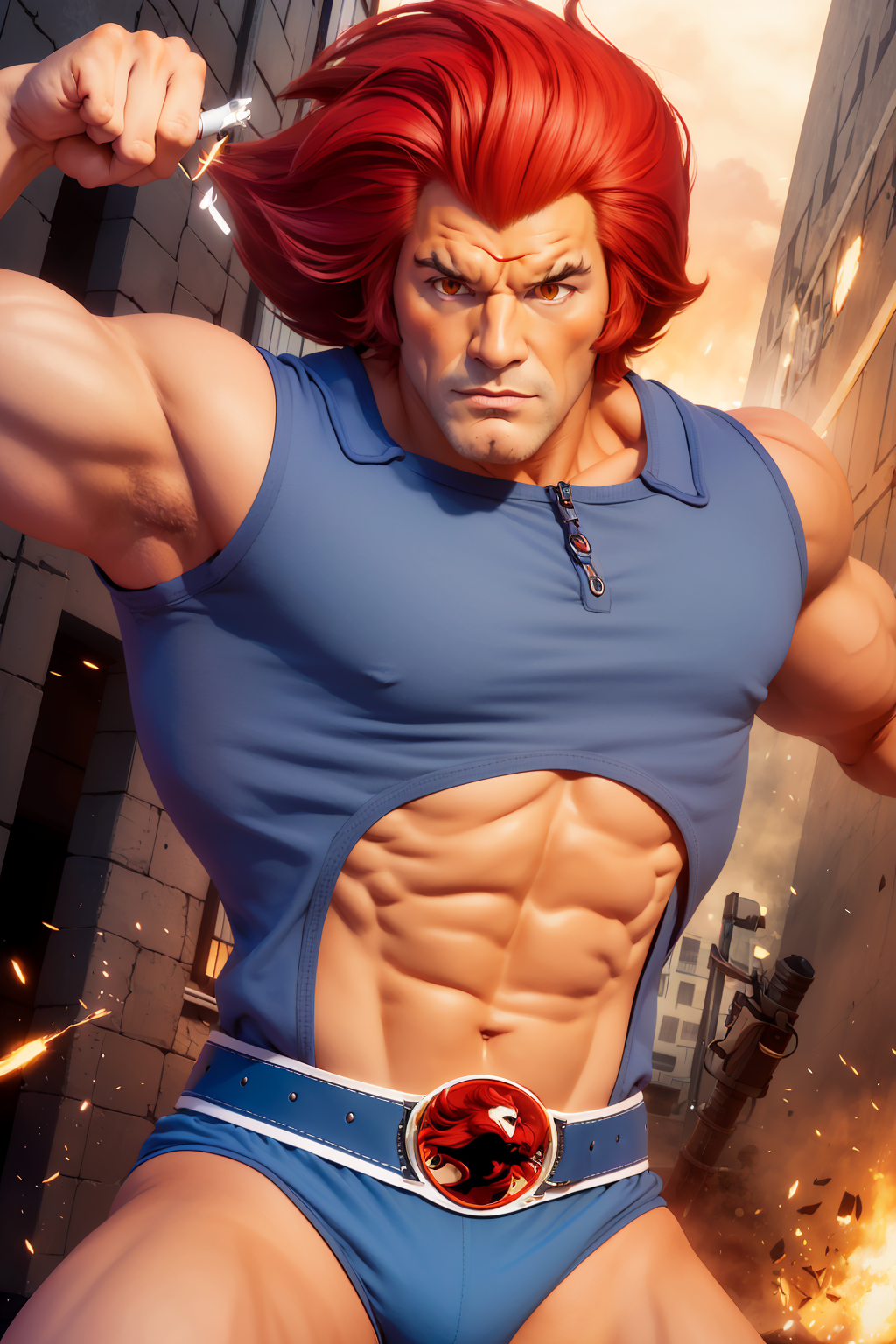 (best quality:1.33), (masterpiece:1.42), (detailed:1.15), (cartoon:1.5), ๋นจ๊ฐ ๋จธ๋ฆฌ, ๋ ํธ๋ก ์ํธ, (lion-oQuiron ์บ๋ฆญํฐ), 1๋ช ์ ์๋ , ํ๋ ์ท, lora:quiron_lion-o_v2_Lora:0.77