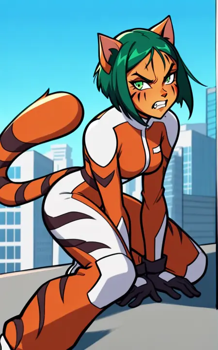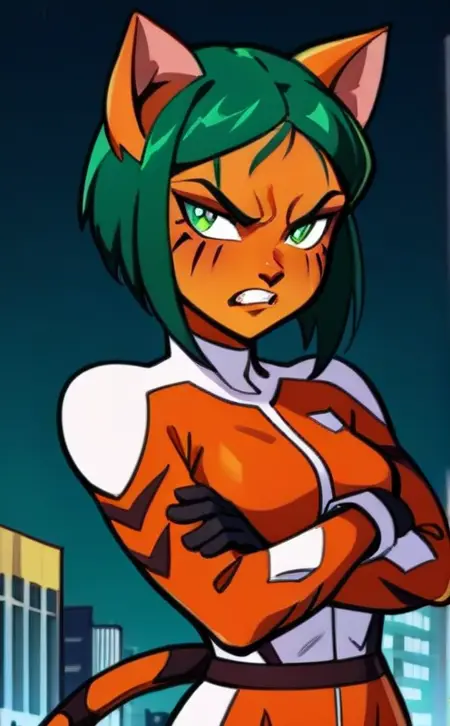 강화 태그: 동물 귀, 단발, 녹색 머리, 주황색 피부, 호랑이 꼬리, 녹색 눈, 얼굴 무늬, 꼬리, 고양이 귀, 고양이 꼬리