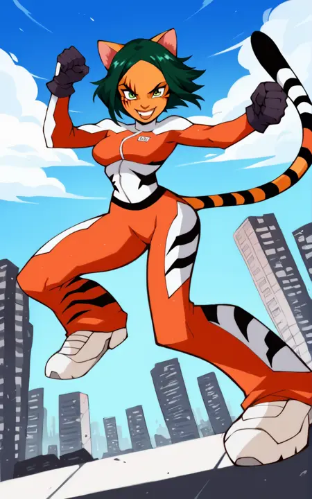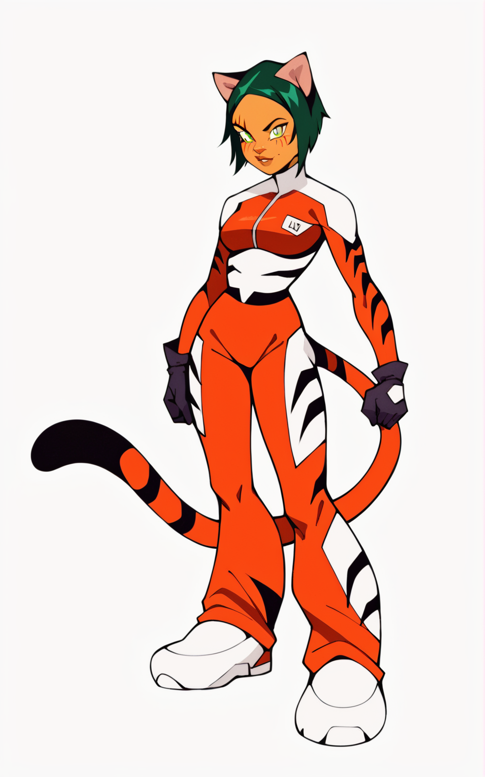 强化标签:动物耳朵、短发、绿发、橙色皮肤、老虎尾巴、绿眼、面部斑纹、尾巴、猫耳、猫尾