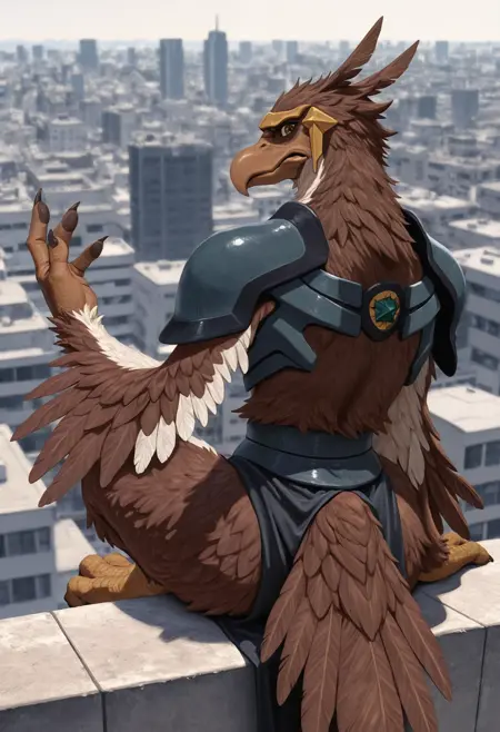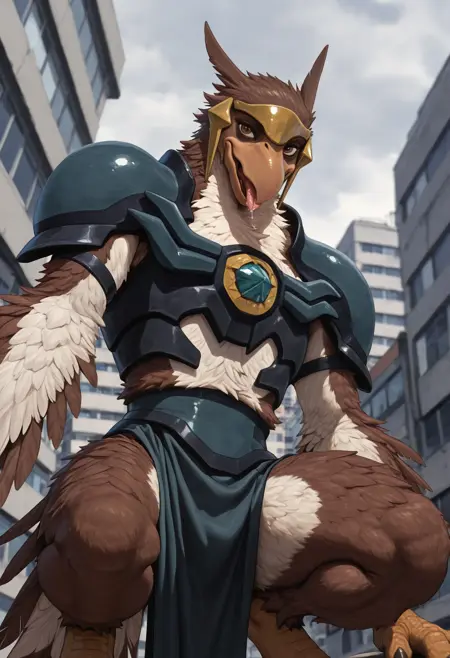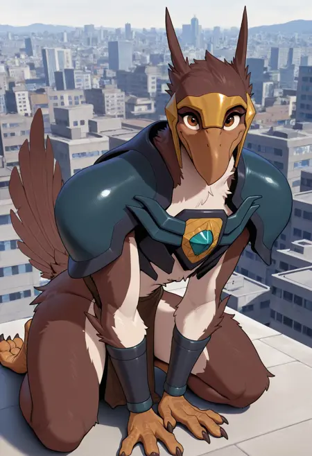 z1nfogel, solo, 1boy, male focus, brown eyes, avian tail, feathers, big eyes, loincloth, wingless, digitigrade, barefoot, biped, armor, clothes