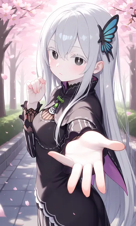 에키드나 (re:zero), 검은 눈, 색상이 있는 속눈썹, 검은 드레스, 회색 머리카락, 매우 긴 머리카락, 머리 장식, 나비 모양 머리 장식, 눈 사이의 머리카락, 창백한 피부