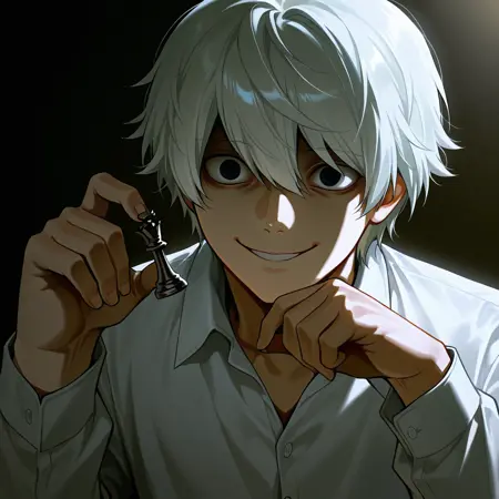 white hair, short hair, grey eyes, bags under eyes