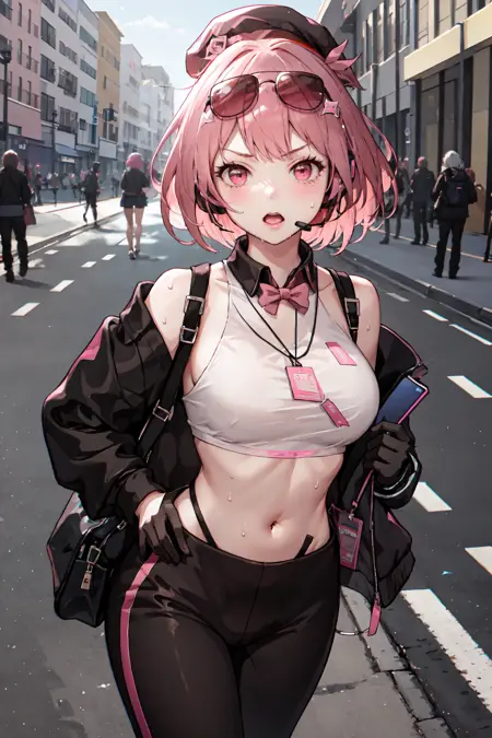 기본 매개변수: willow, 검정 재킷, 분홍색 머리, 단발, 머리에 안경, 검정 베레모, 흰색 캐미솔, 검정 허벅지 양말, 검정 치마, 젯타이 루오기, 검정 장갑, 배지,