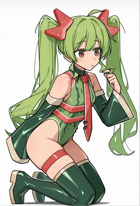 녹색 머리카락, 아호게, 수박 머리 장식, 듀얼 테일, 측면 머리카락, 빨간 눈, 매우 긴 머리카락, 어깨 노출, 빨간 넥타이, 녹색 레오파드, 분리형 소매, 넓은 소매, 소매가 손목을 넘어감, 하이레그 레오파드, 빨간 허벅지 스트랩, 단일 스트랩, 녹색 허벅지 양말, 허벅지 부츠