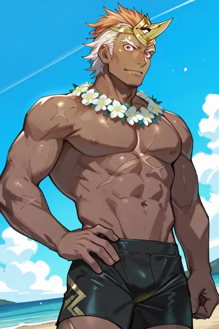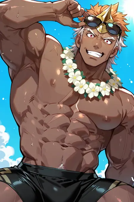 여름복: helbindi_feh, 다채로운 머리카락, 붉은 눈, 검은 피부를 가진 남성, 꽃 화관, 검은 남성용 수영복,