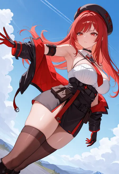 raprhd,红眼睛,红发,长发,刘海,黑色贝雷帽,交叉式吊带上衣,黑色项圈,可拆卸衣领,红色领带,大胸部,黑色夹克,露肩,白色衬衫,黑色短裙,臂章,腰带,腰带包,黑色手套,双色手套,棕色过膝袜,及膝靴