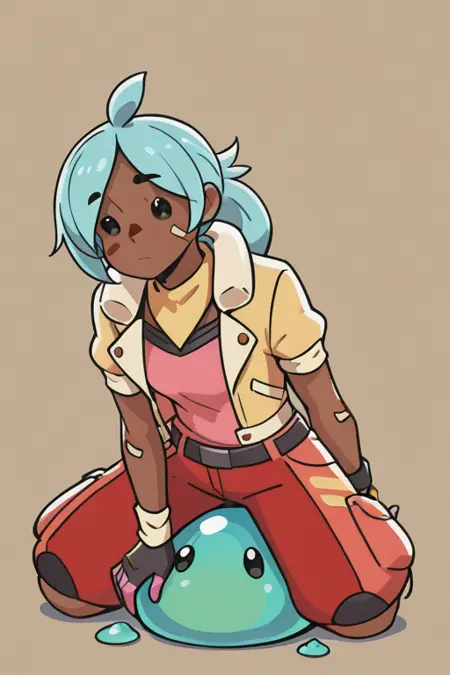 Prompts: Beatrix_Lebeau, Blue Hair, Black Eyes, Beady Eyes, Dark Skin, bandaid, Yellow Jacket, Yellow Bandana, Pink Shirt, Red Shorts