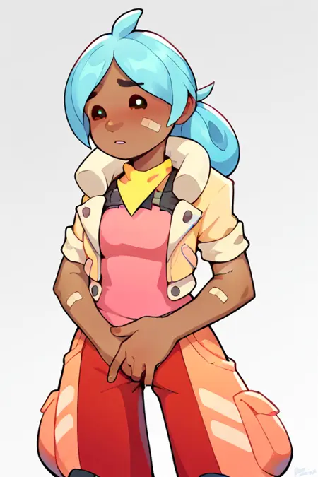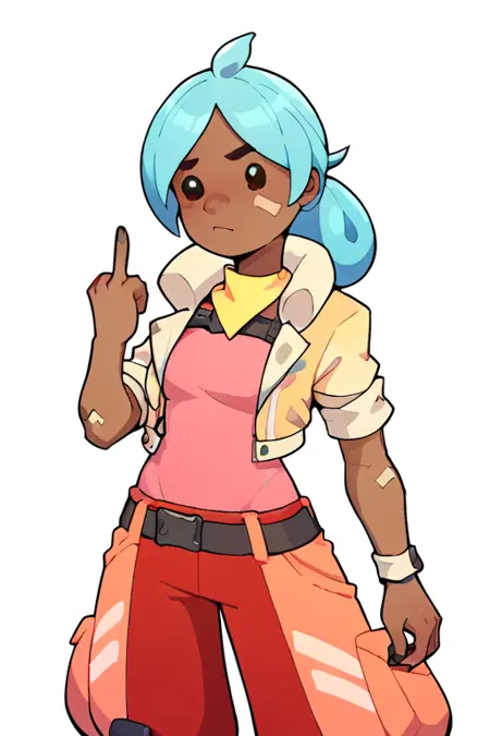 Prompts: Beatrix_Lebeau, Blue Hair, Black Eyes, Beady Eyes, Dark Skin, bandaid, Yellow Jacket, Yellow Bandana, Pink Shirt, Red Shorts