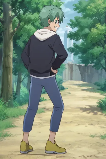 プロンプト: 男性、緑色の髪、濃い緑色の目、黒いジャケット、白いフード、グレーのTシャツ、グレーのプリントシャツ、青いズボン、黄色い靴、屋内(王座の間/教会)、屋外(都市/自然/瓦礫)