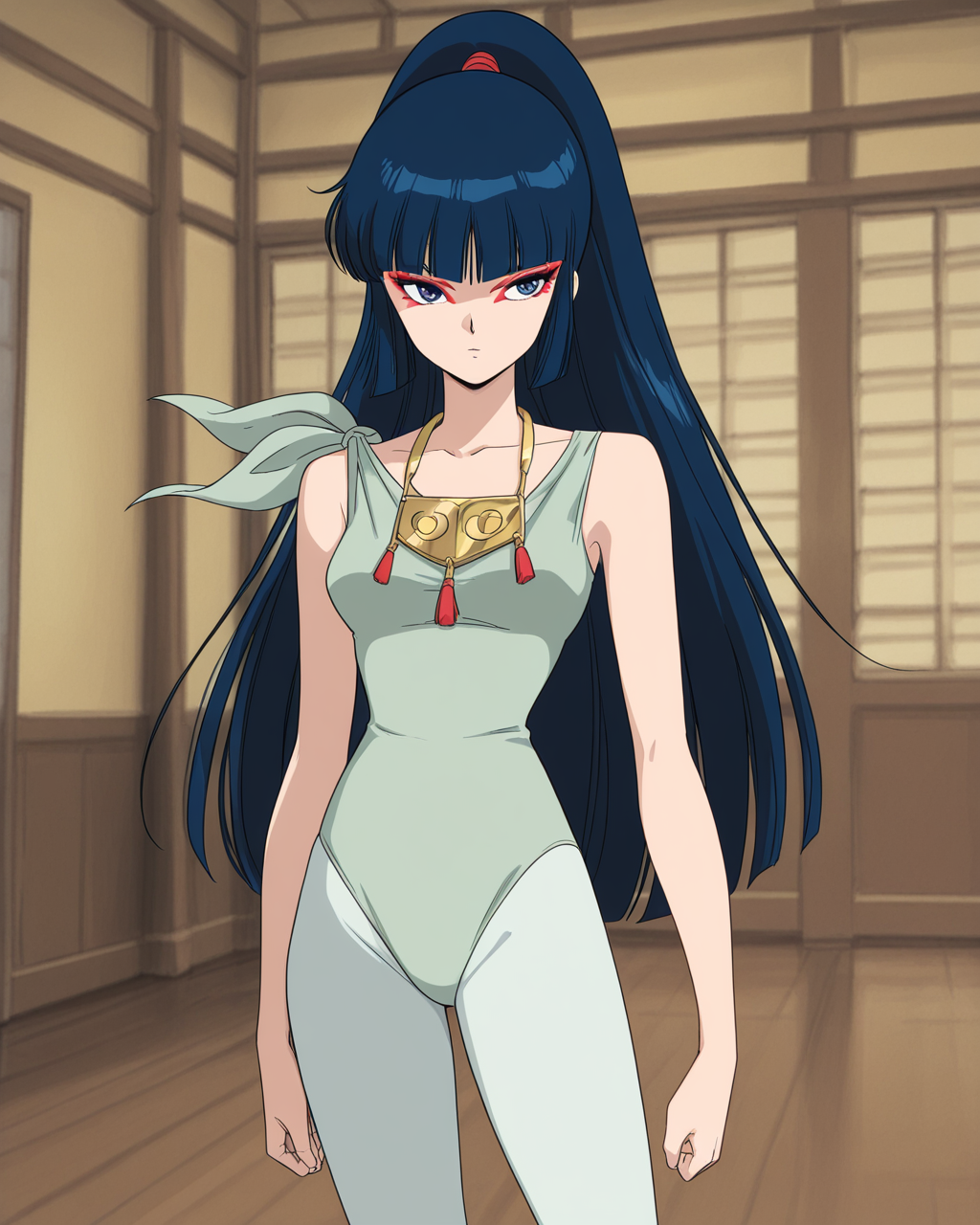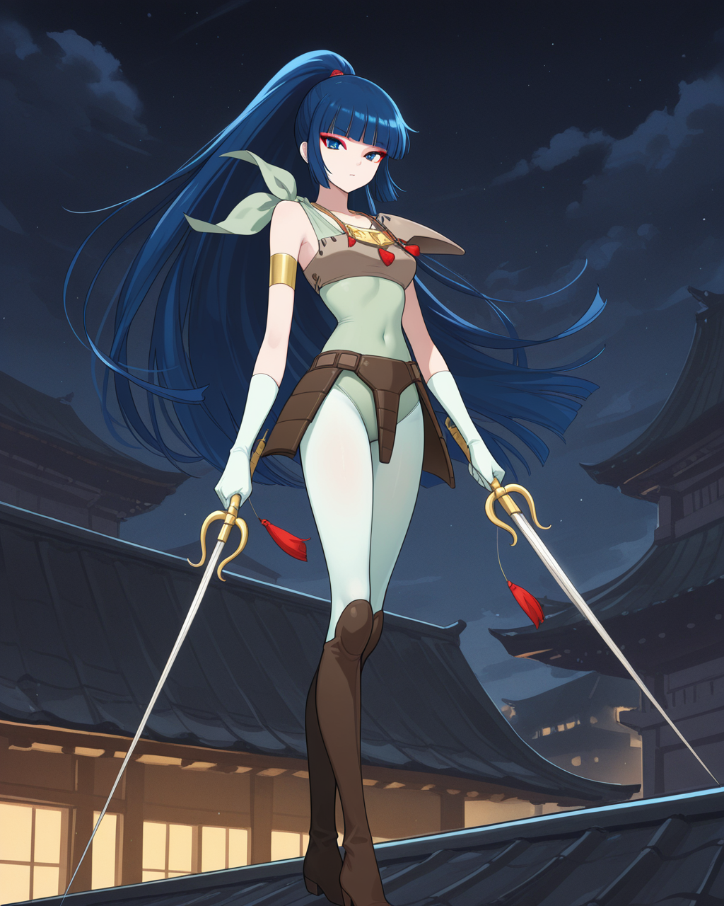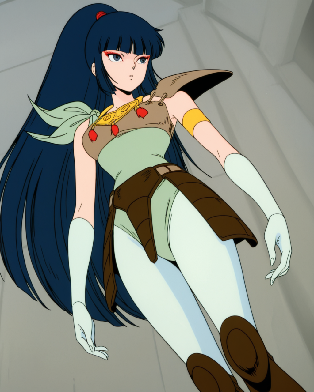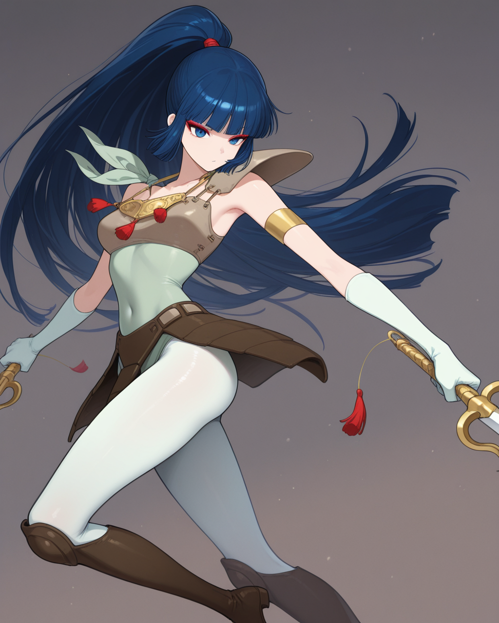 kayurawar, 1girl, solo, blue hair, long hair, blunt bangs, ponytail, blue eyes, red eye makeup, green leotard with shoulder tie, pale green tights, boots, armor with shoulder guard, waist armor, gold necklace, pale green gloves, single gold armband