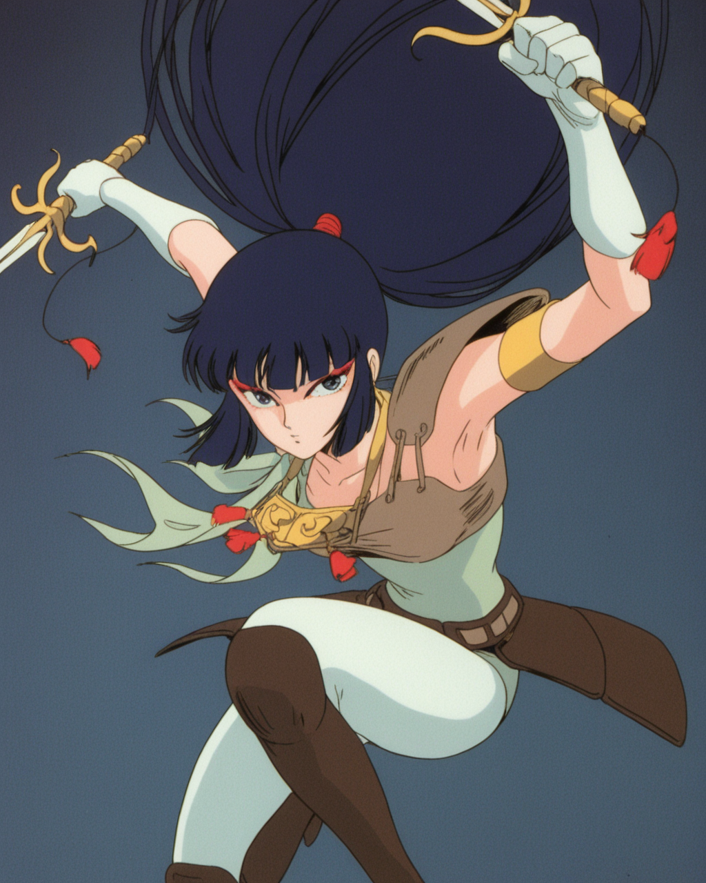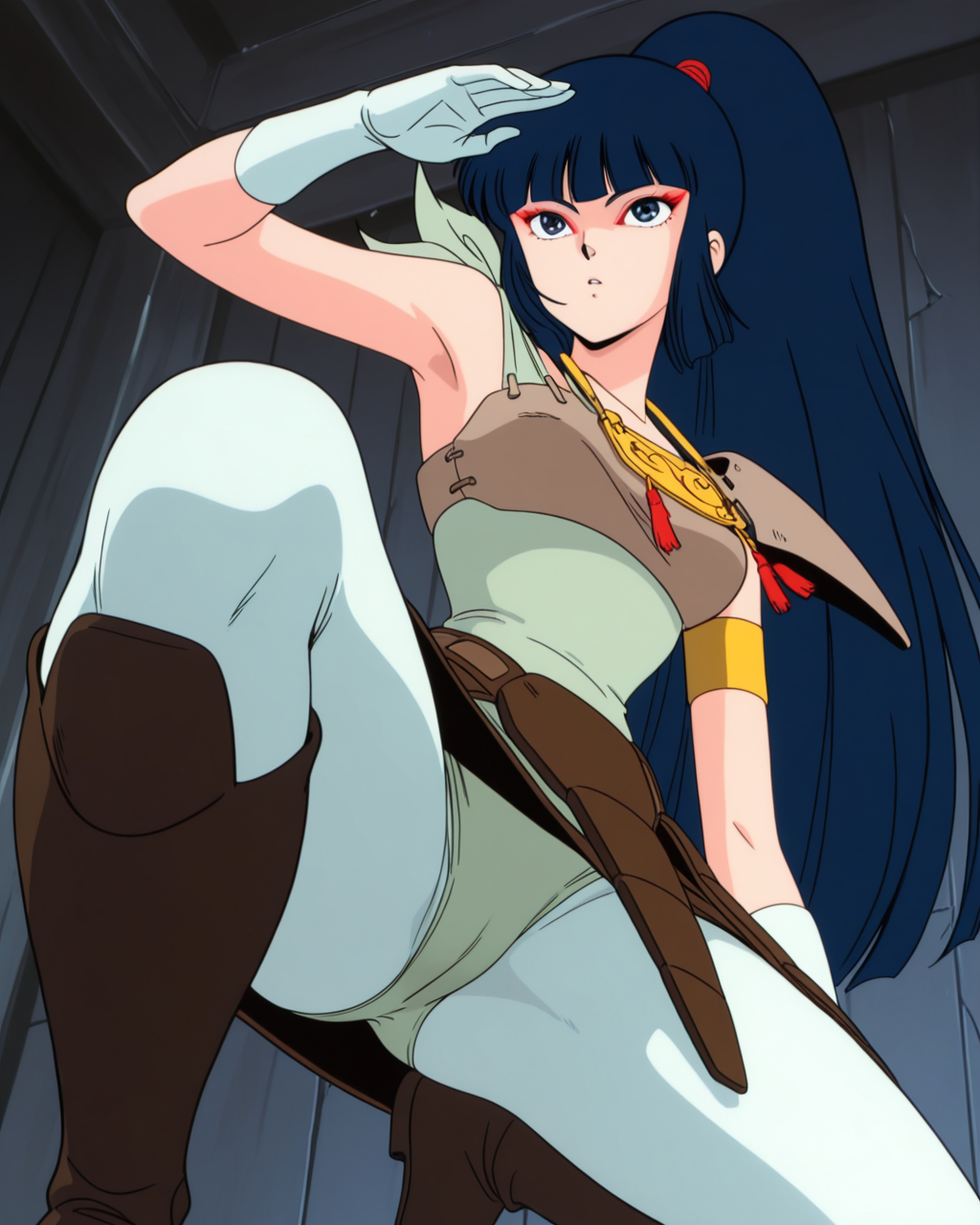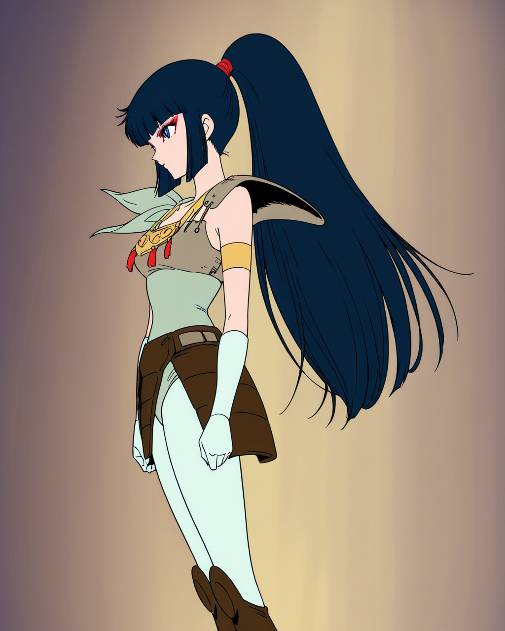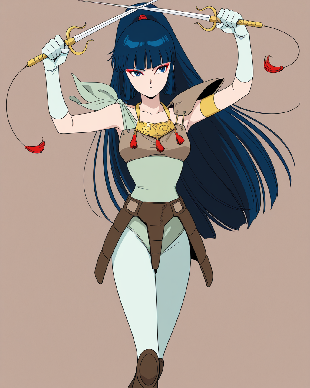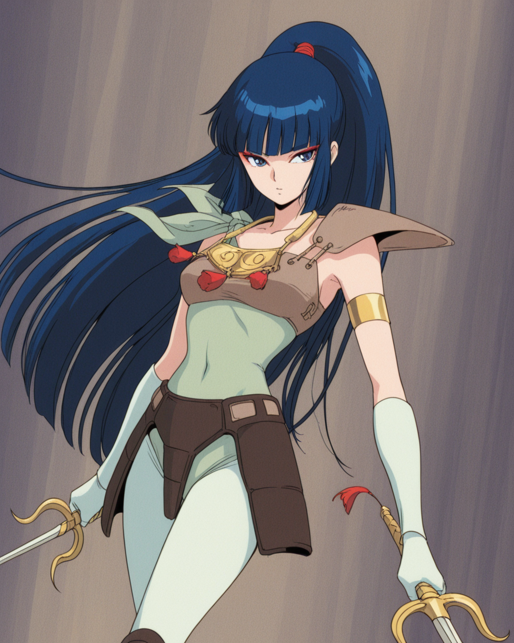kayurawar, 1girl, solo, blue hair, long hair, blunt bangs, ponytail, blue eyes, red eye makeup, green leotard with shoulder tie, pale green tights, boots, armor with shoulder guard, waist armor, gold necklace, pale green gloves, single gold armband