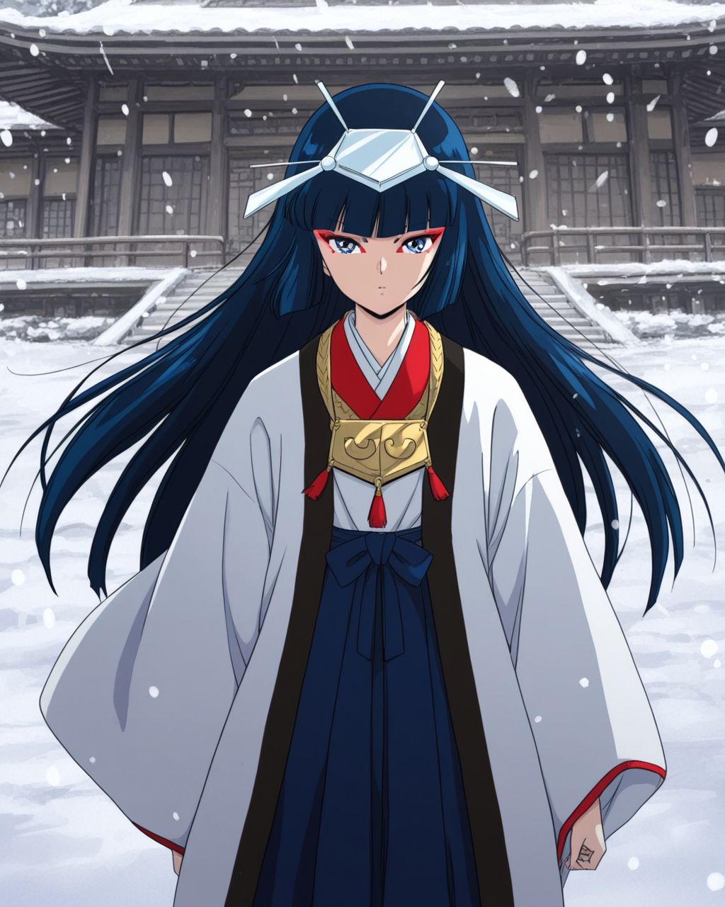 kayuraprst, 1girl, solo, blue hair, long hair, blunt bangs, hair down, eyes closed, red eye makeup, mirror headgear, white kimono red trim, gold necklace, blue skirt