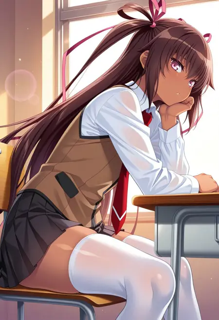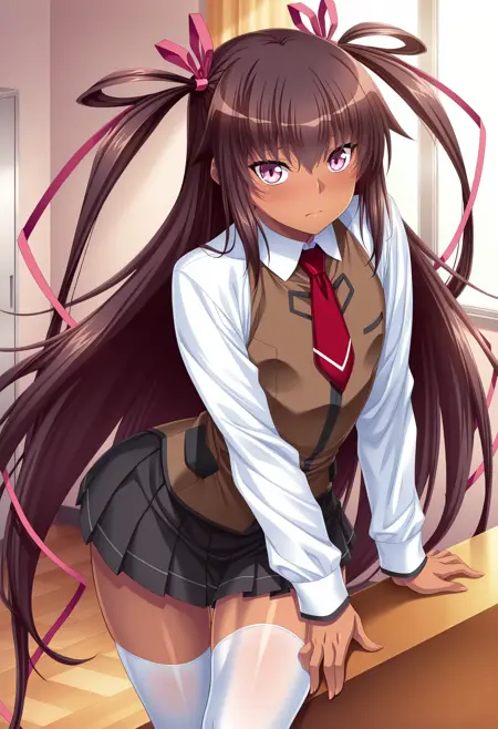 衣装: 白いシャツ、赤いネクタイ、ロングスリーブ、茶色のベスト、黒いプリーツスカート、白いサイハイソックス