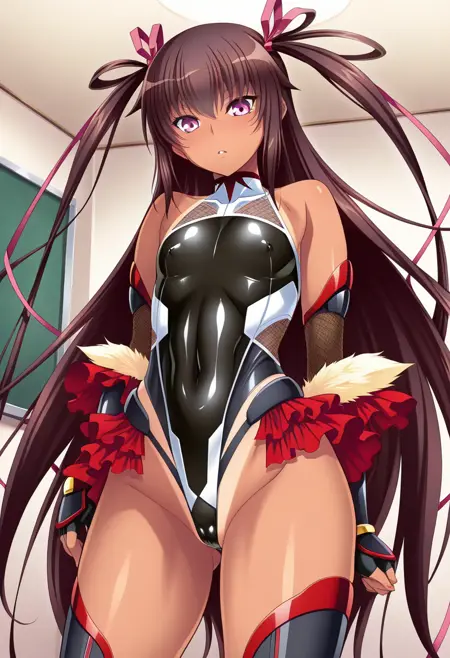 衣装: ブラックレオタード、レオタード、フィッシュネット、フリル付きエルボーグローブ、フリル、レッド・ショーガールスカート、太ももブーツ、フィンガーレスグローブ、アーマー