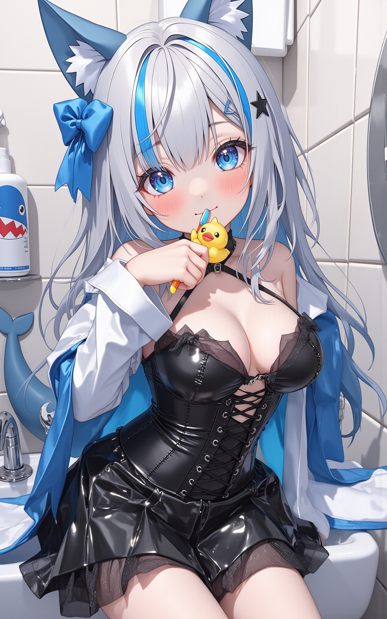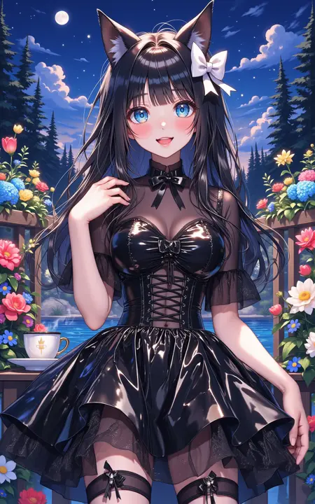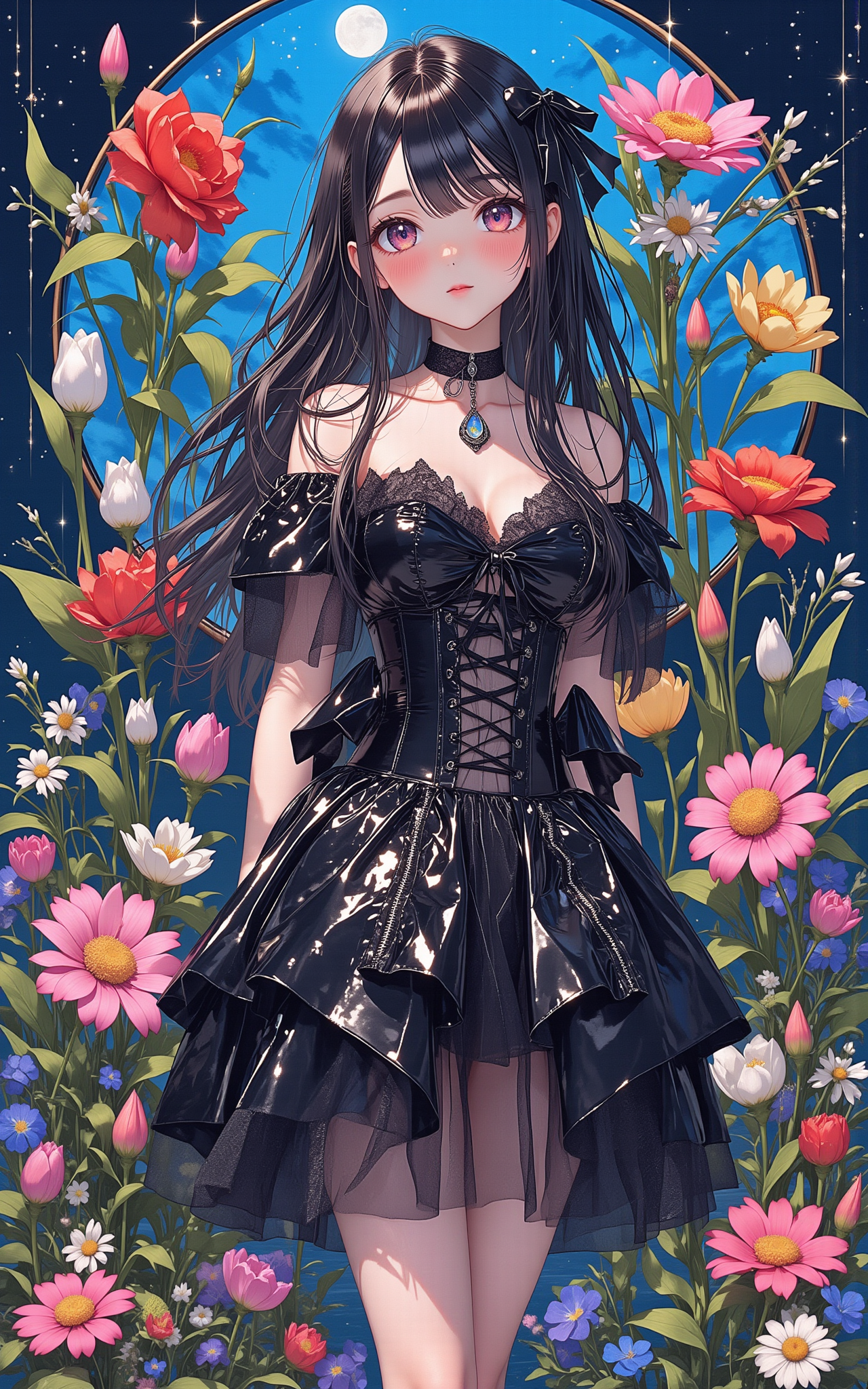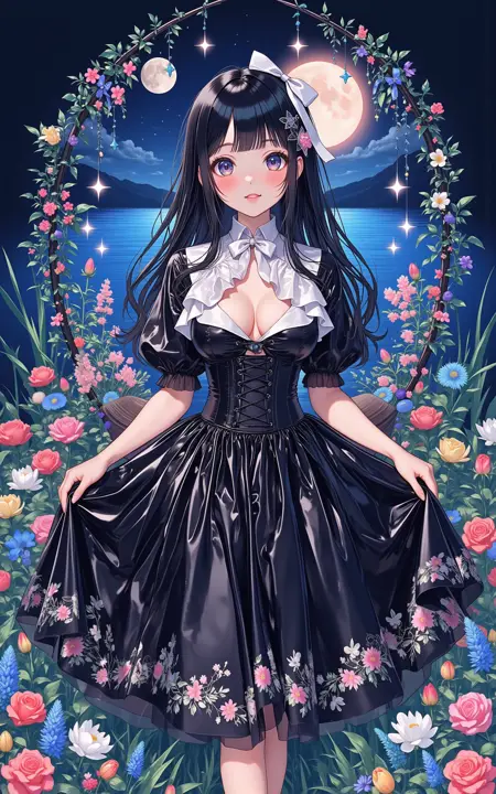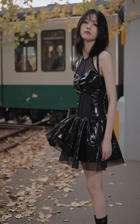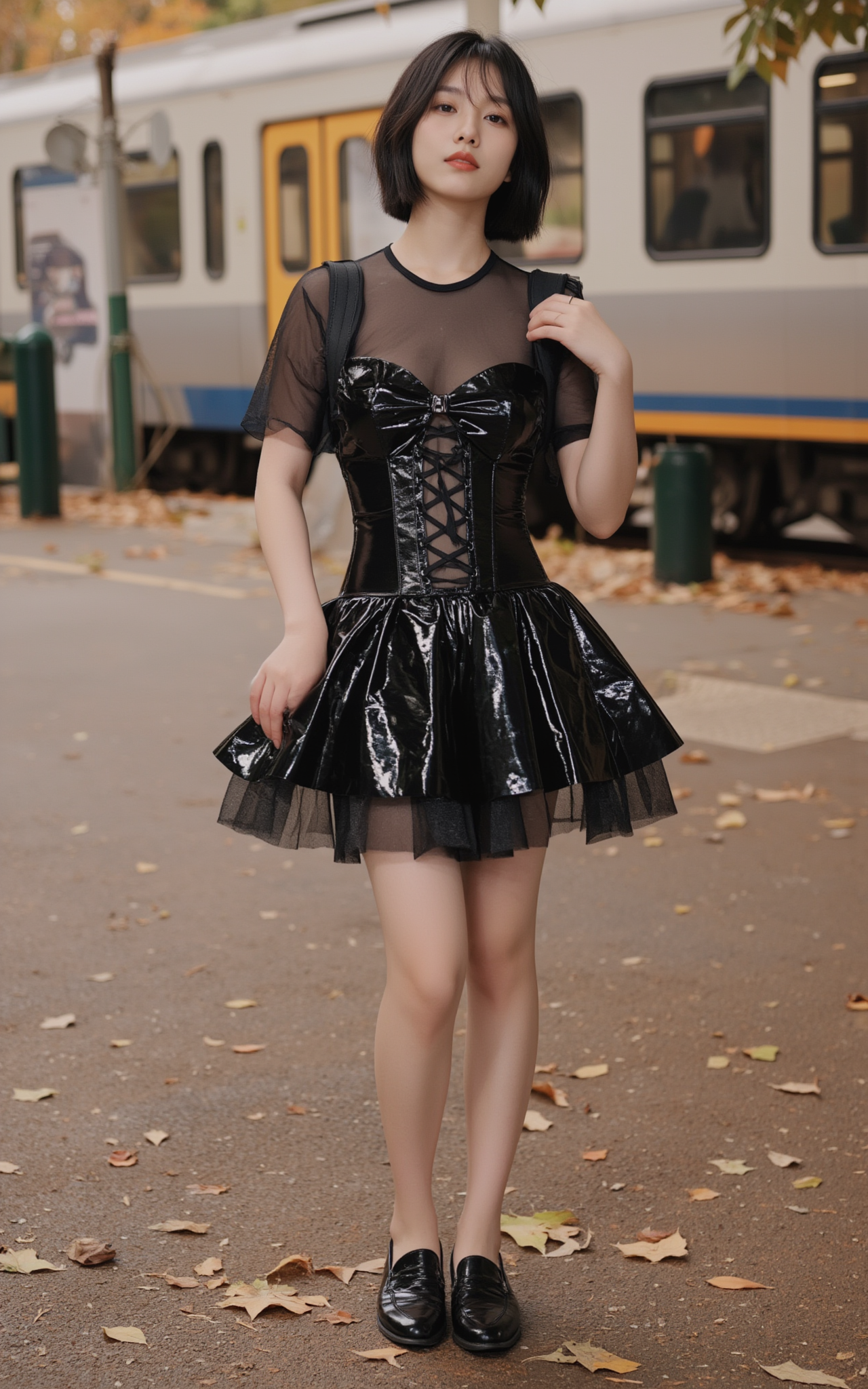 프롬프트 단어는 매우 중요합니다. 이 옷을 재현하려면 세부적으로 묘사하는 것이 좋습니다. 제가 작성한 내용은 다음과 같습니다: 허리와 가슴 부분에 레이스 장식이 있는 검정색으로 반짝이는 비닐 코르셋 스타일의 드레스. 이 옷은 전胸前부에서 목까지 레이스로 만들어졌으며, 앞면에 튜투를 추가하는 것도 허용됩니다.