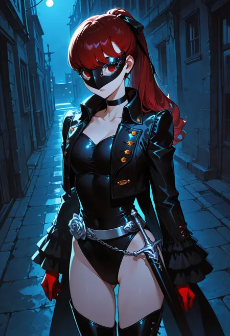 p5yoshizawa-violet, 긴 머리, 빨간 머리, 앞머리, 팻테일, 검은 머리 리본, 검은 초크, 검은 재킷, 열린 재킷, 코어테일, 검은 레오타드, 은색 벨트, 휘트, 은색 장미, 주름 Sleeve, 빨간 장갑, 검은 허벅지 부츠, 하이힐, 허벅지 긴 양말, 마스크,