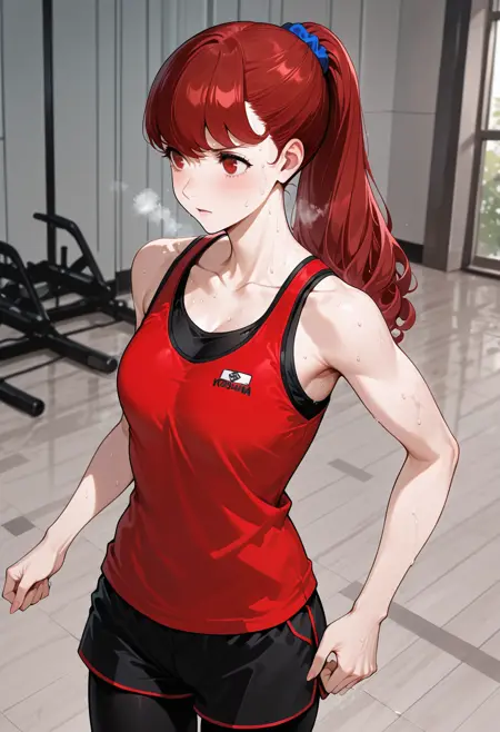 p5yoshizawa-workout, 스포츠웨어, 스쿠니, 파란색 스쿠니, 어깨 노출, 텅 탑, 빨간 텅 탑, 계층적 셔츠, 스포츠 브라, 검은 스포츠 브라, 검은 반바지, 짧은 반바지, 반바지 아래 다리 착용, 흔적, 검은 레깅스,