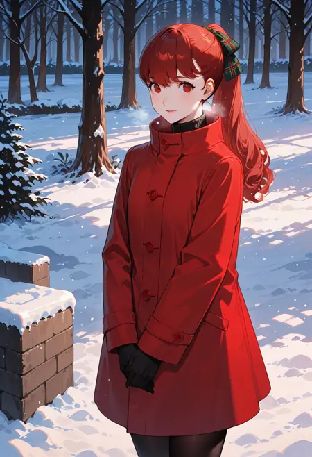 p5yoshizawa-coat, 코트, 빨간 코트, 검은 팬티스타킹, 긴 소매, 검은 터틀넥, 리본, 머리 리본, 녹색 체크 무늬 리본,