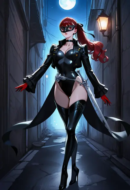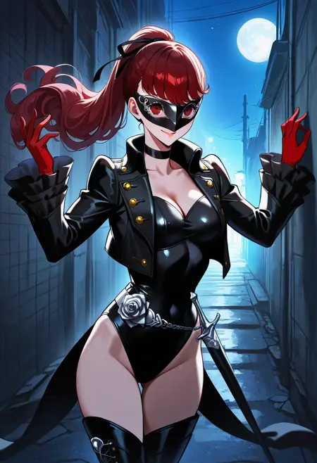 p5yoshizawa-violet, 긴 머리, 빨간 머리, 앞머리, 팻테일, 검은 머리 리본, 검은 초크, 검은 재킷, 열린 재킷, 코어테일, 검은 레오타드, 은색 벨트, 휘트, 은색 장미, 주름 Sleeve, 빨간 장갑, 검은 허벅지 부츠, 하이힐, 허벅지 긴 양말, 마스크,