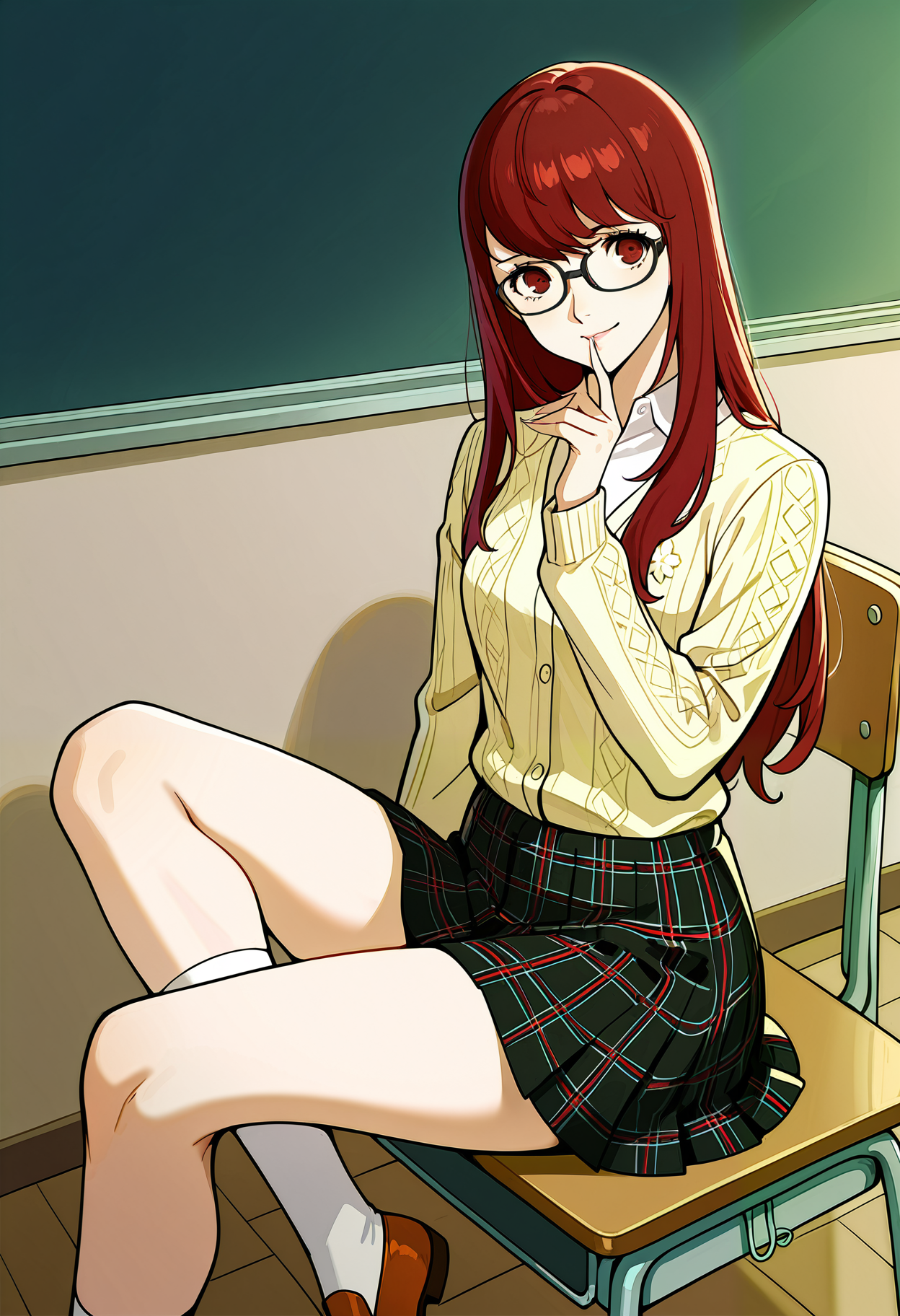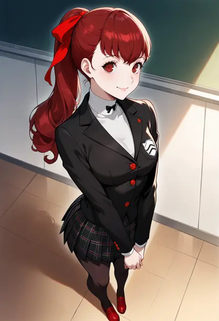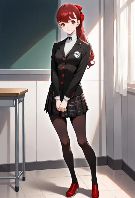 p5yoshizawa-winuni, 학교 유니폼, 흰색 터틀넥, 검은 리본 넥타이, 검은 재킷, 학교 문장, 빨간 단추, 체크무늬 스커트, 주름 스커트, 검은 팬티스타킹, 수진 학교 유니폼, 빨간 로퍼,