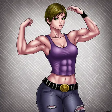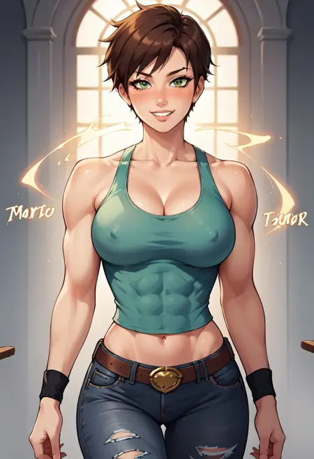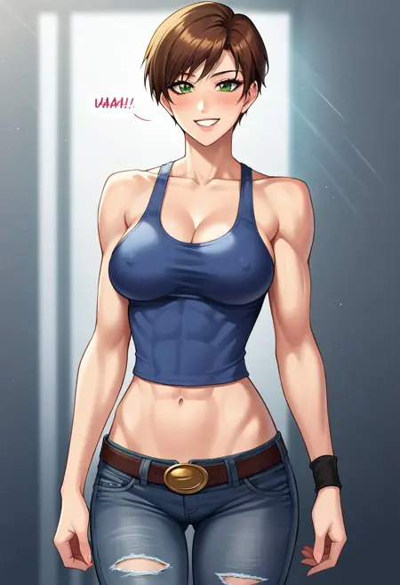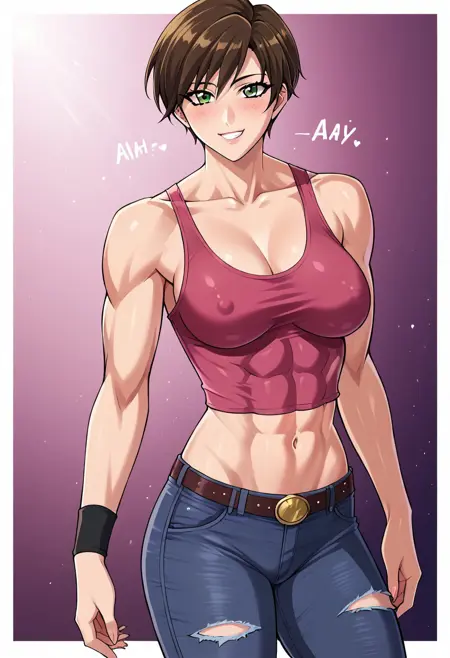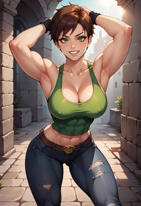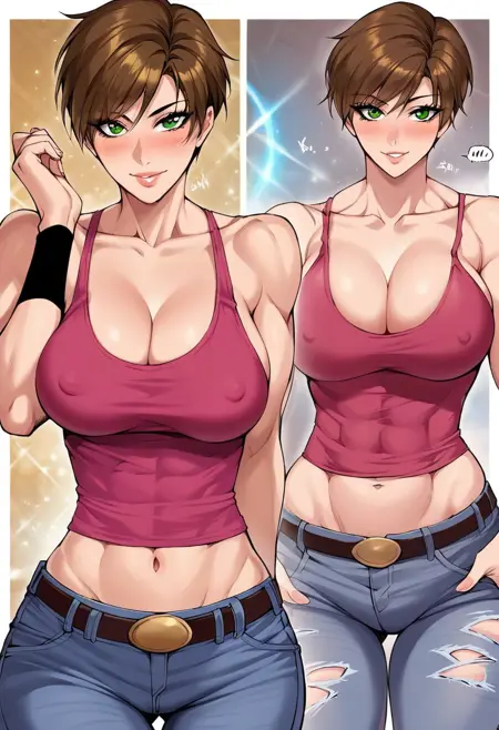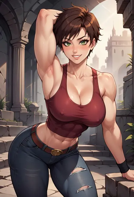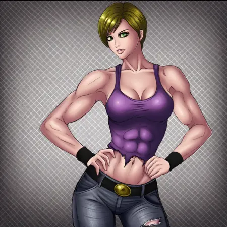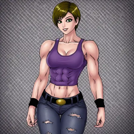 TanktopGirlOPM,1个女孩,单独,肌肉女性,假小子,短发,深金色头发,绿色眼睛,嘴唇,大乳房,二头肌,背心,乳沟,肚脐,腹部,腹股沟,腰带,破洞牛仔裤,黑色腕带,运动鞋,锁骨,腹肌,