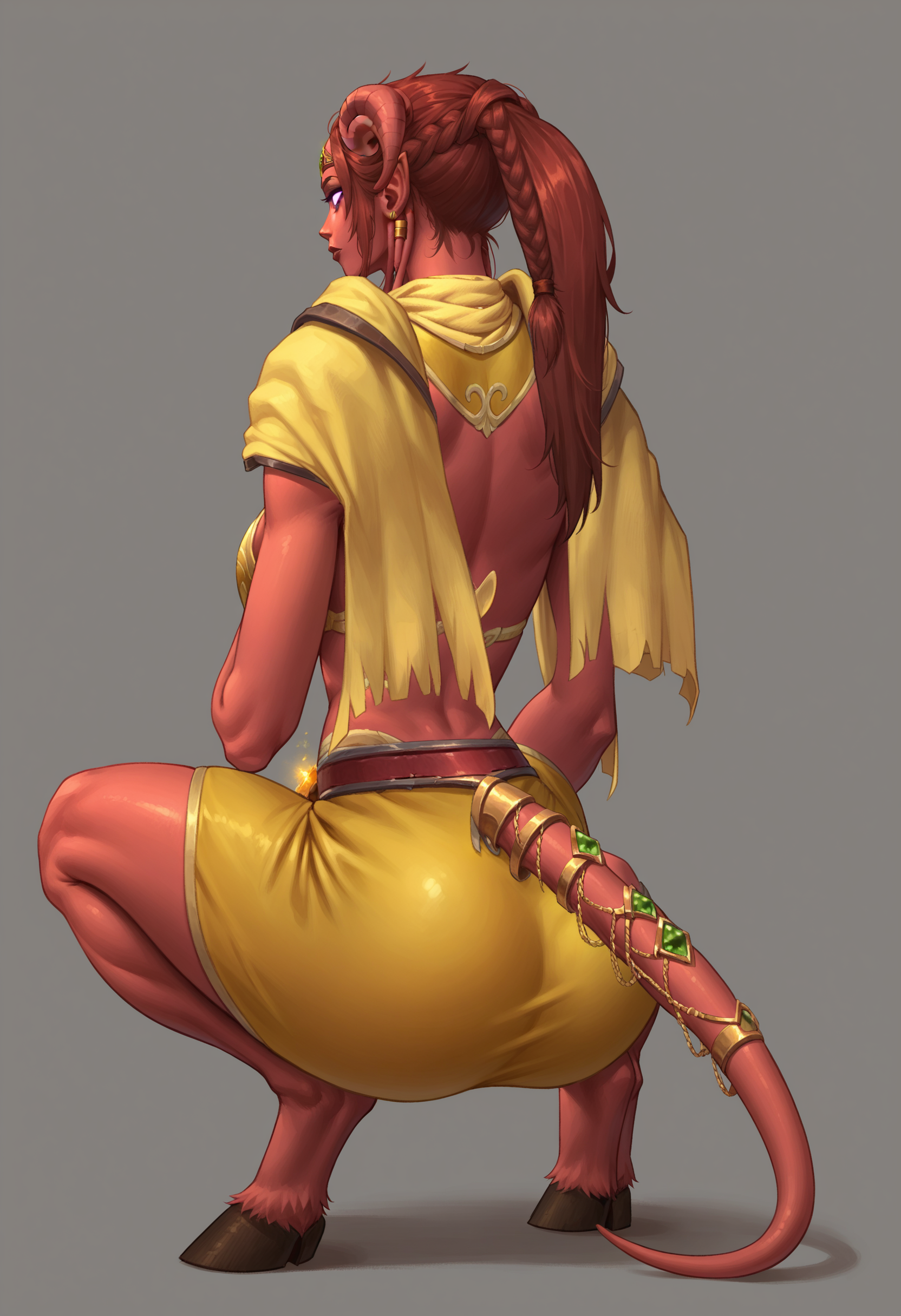 Annora,female,draenei, red skin, long red hair, braided ponytail hair, gold tiara with emerald, glowing pink eyes, red curved horns, golden dress, golden scarf, golden fabric shoulderpads,