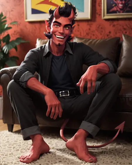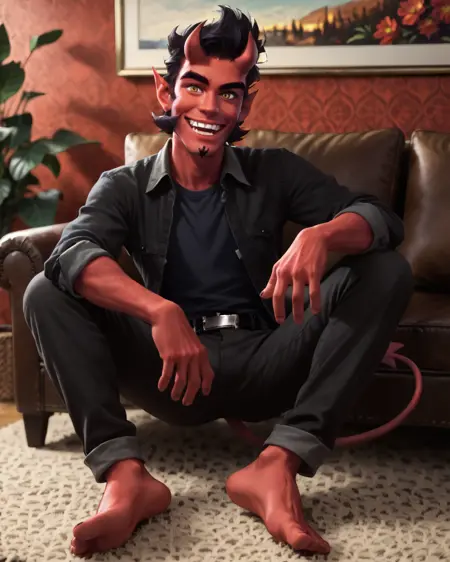 Hellbent, Red skin, Yellow eyes, goatee facial hair, black hair, horns, demon tail, thick eyebrows, male