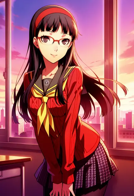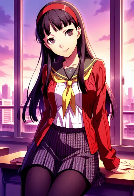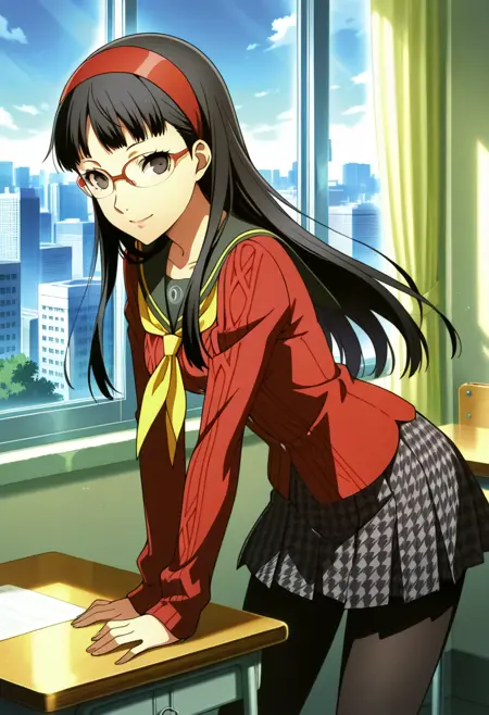 p4yukiko-winuni, yasogami school uniform, school uniform, sailor collar, yellow neckerchief, sweater, red sweater, skirt, pleated skirt, houndstooth, pantyhose, black pantyhose,