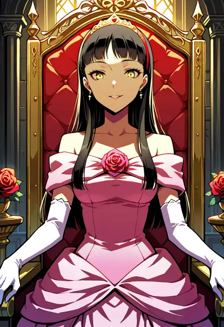 p4yukiko-shadow, yellow eyes, tiara, ballgown, pink ballgown, pink dress, bare shoulders, flower, rose, red rose, elbow gloves,