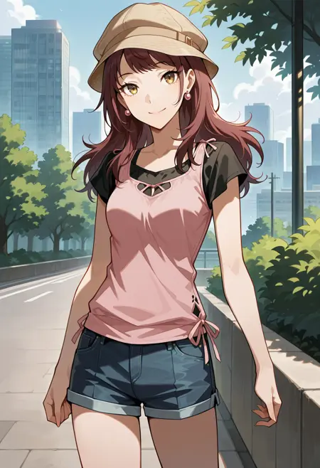 p4rise-sumcas2, 另一种发型, 发丝垂下, 帽子, 休闲装, T恤, 黑色T恤, 无袖背心, 粉色无袖背心, 层叠上衣, 短裤, 蓝色短裤, 牛仔短裤