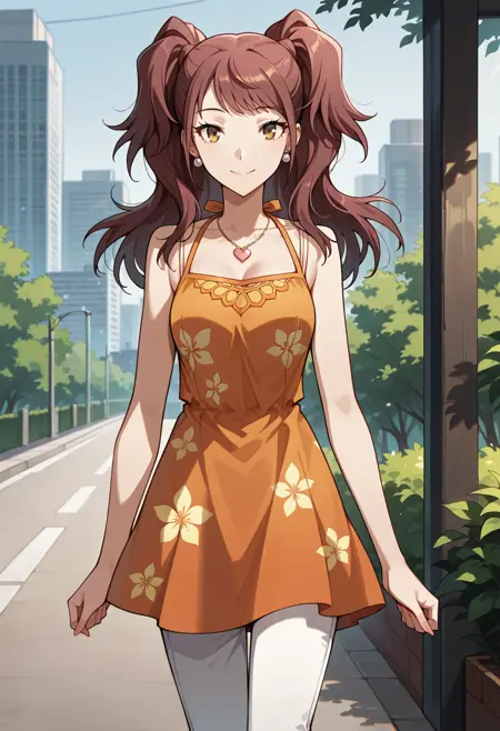 p4rise-sumcas, 心形项链, 吊坠, 连衣裙, 短款连衣裙, 橙色连衣裙, 吊带裙, 细肩带, 花卉印花, 裤子, 七分裤, 白色裤子, 凉鞋