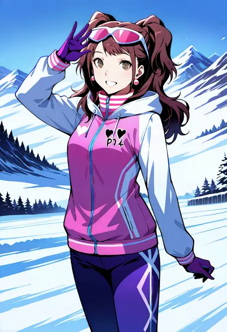 p4rise-ski, jacket, pink jacket, long sleeves, white sleeves, hood, gloves, purple gloves, pants, blue pants, heart \(symbol\),