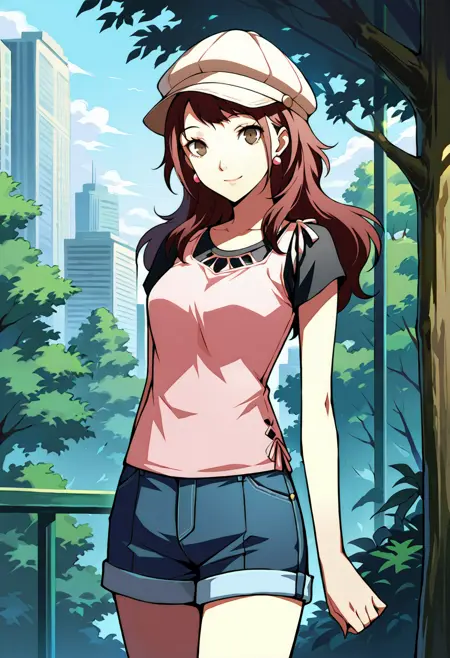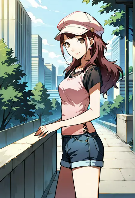 p4rise-sumcas2, alternate hairstyle, hair down, hat, casual, t-shirt, black t-shirt, tank top, pink tank top, layered shirt, shorts, blue shorts, denim shorts,