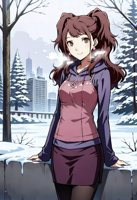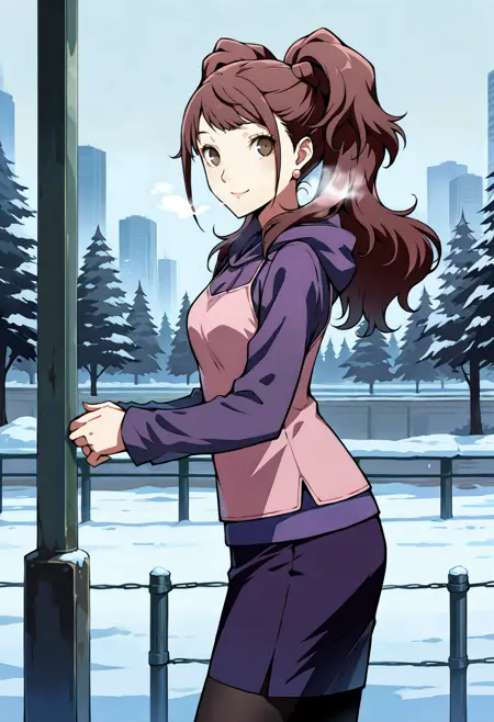 그녀의 겨울 캐주얼 복장은 약간 일관성 없지만, 부분적으로는 그저 좀 이상한 옷이기 때문이기도 합니다. 그녀는 보라색 후디에 티셔츠를 겹쳐 입고 있는 것 같네요? 또한 그녀의 여름 캐주얼 2에서는 모자 안에 트윈테일이 나타나므로, 프롬프트에서 twintails를 제거하고 hair down을 추가하는 것을 잊지 마세요.