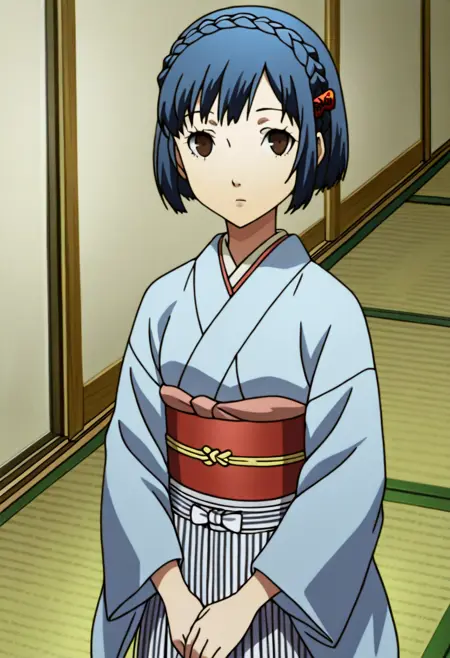 그녀가 애니메이션에서만 등장하므로, 이 스타일에 강한 편향이 있다. 학습 데이터에는 기모노와 야소가미 고등학교 트랙 자켓을 입은 그녀의 장면이 포함되어 있지만, 이는 충분하지 않아 실제 "옷차림"으로 간주되기 어렵다.