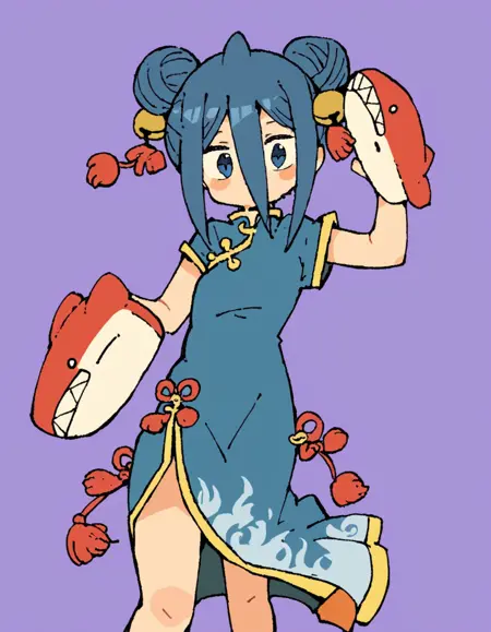 파란 머리, 긴 머리, 눈 사이의 머리, 학교 교복, serafuku, 파란색 교복, 흰색 선원색 칼라, 날카로운 이빨, 파란 눈, 장난감 인형, 인형, 갈색 신발
