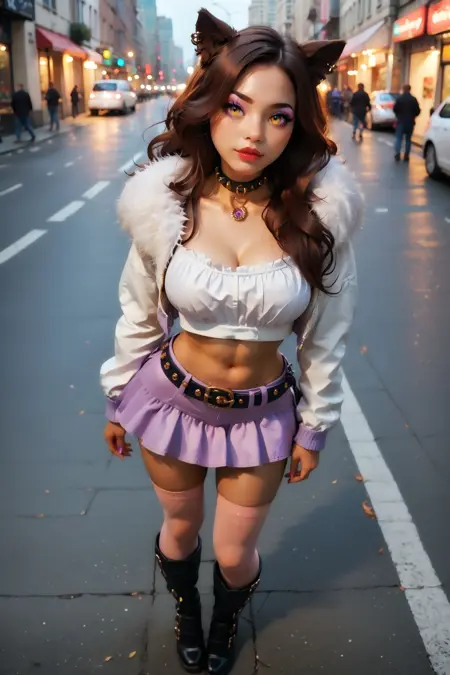 衣装プロンプト: purple skirt, black cropped jacket, fur-trimmed jacket, pink shirt, leopard print shirt, fishnets thighhighs, collar, belt, midriff, knee boots, midriff, cleavage, big golden necklace, piercing, hoop earrings, zettai ryoiki