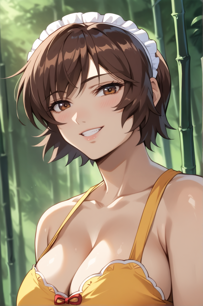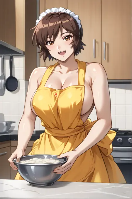 huge breasts, short hair, brown hair, brown eyesAttire