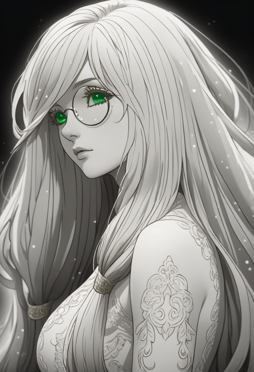 angelbaret, green eyes, long hair, hair tubes, porcelain skin, nude, no nipples, white hair, whitescale skin, yellow tattos