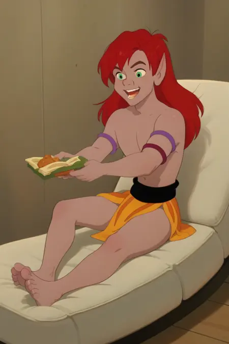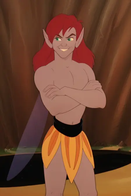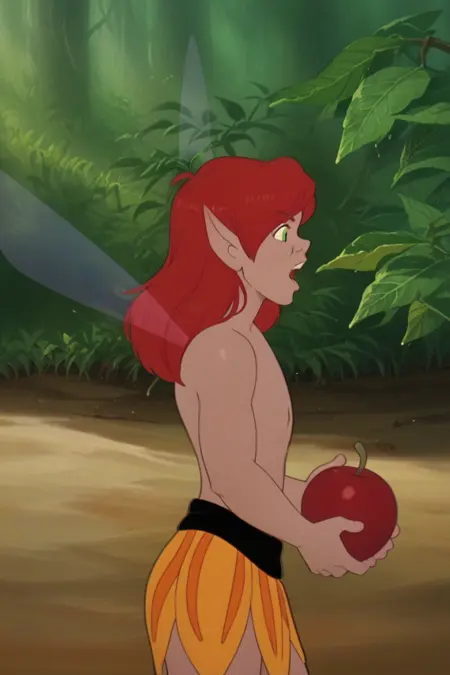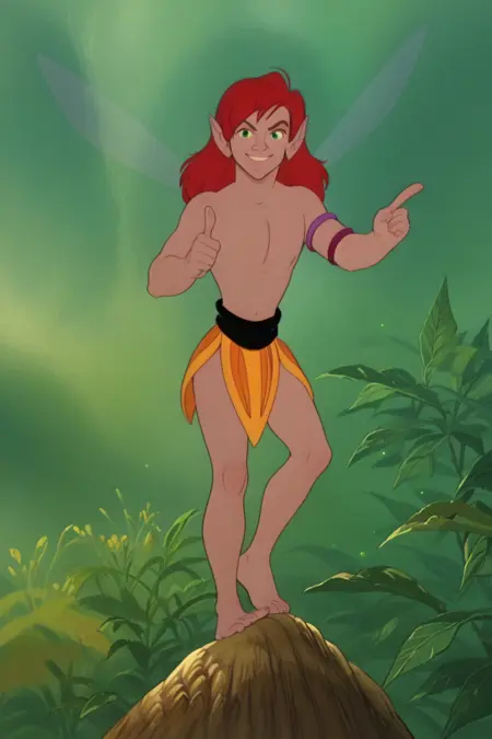 pips, red hair, green eyes, pointy ears, fairy wings, yellow loincloth, armbands,