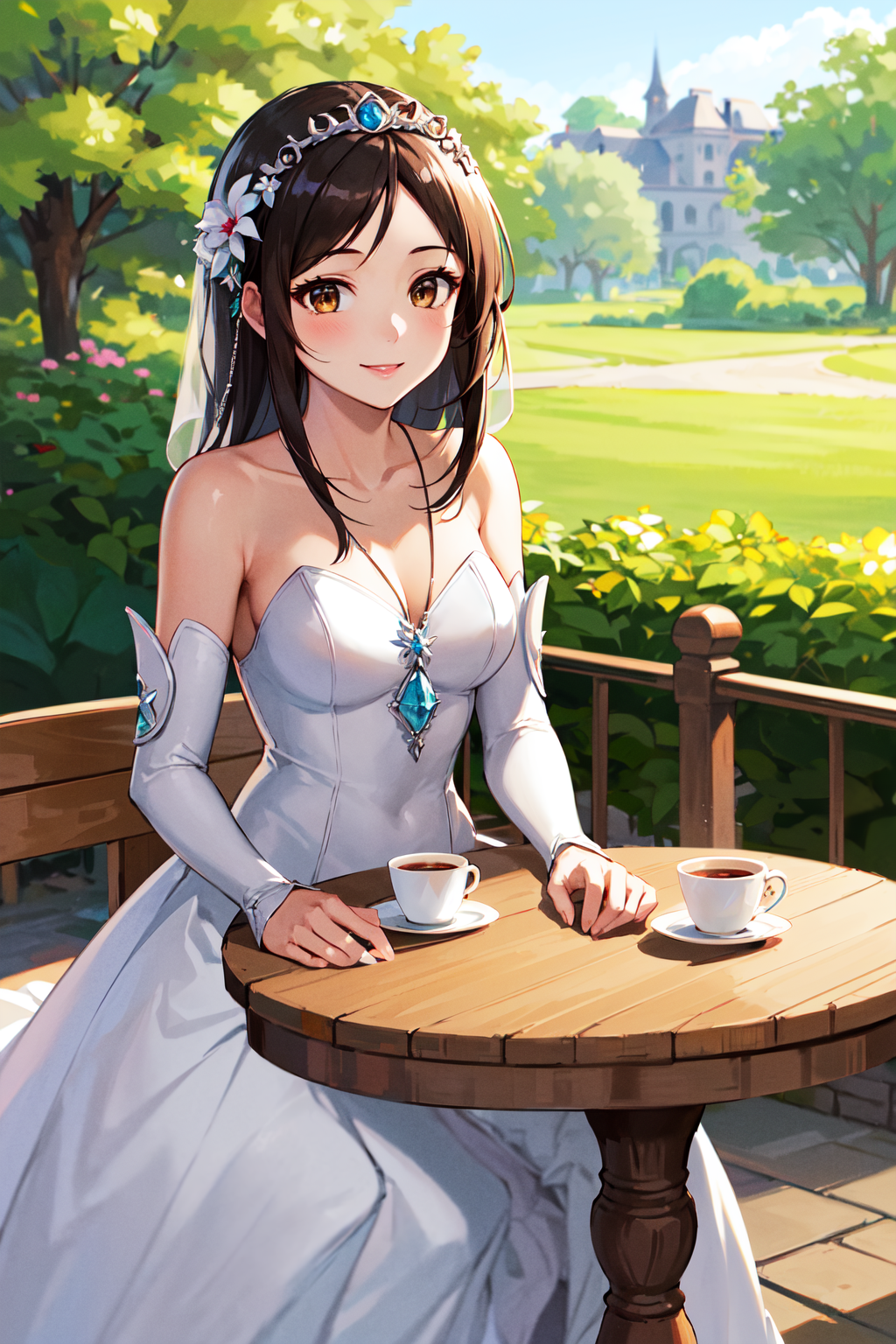 衣装3aagarnet, (低く結んだ長い髪:1.2), 茶色の目, 皇冠, 髪飾り, ジュエリー, ネックレス, 結婚式用ドレス, 白いドレス, 肩を露出, 外側の袖