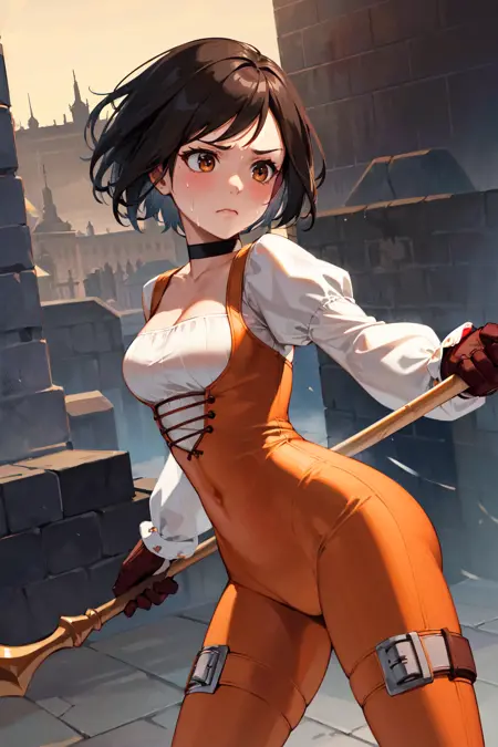 衣装1(長い髪)aagarnet, (低く結んだ長い髪:1.2), 茶色の目, チョッカー, オレンジ色のボディスーツ, パフスリーブ, 長い袖, グローブ